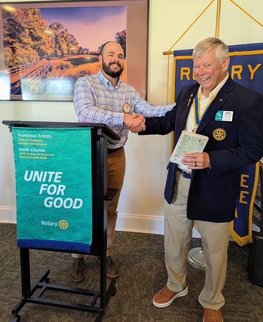 Rotary District Governor Keith Clayton spoke to our club during our regular meeting on October 16. Governor Keith leads 48 clubs in Southern Mississippi and Southeastern Louisiana. He spoke about Rotary's goal of eliminating Polio worldwide. We have only two more countries, Afganistan and Pakistan to eliminate this destructive disease. He also spoke about his passion, which is literacy. He gave several ideas that individual clubs can implement to positively impact literacy in our area. Thanks, Keith for your inspiring message. Club President Chase Villerete is shown thanking Keith.